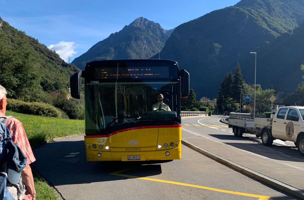 Per raggiungere questi luoghi, anche questa volta ho usato il sistema dei trasporti pubblici svizzeri: ho lasciato la mia auto nel parcheggio della stazione di Chiasso ed ho raggiunto in treno la stazione di Castione-Arbedo. Appena fuori la stazione, ho preso l’AutoPostale 214 fino alla fermata di Grono-Bivio Calanca. Qui ho aspettato la coincidenza con l’AutoPostale 215 fino alla fermata di Arvigo Paese, mentre per il ritorno ho ripreso la linea 215 poco più avanti, alla fermata di Selma, dopo essere disceso da Landarenca utilizzando la comoda funivia automatica al costo di 4 CHF per corsa, gli euro qui non sono accettati.